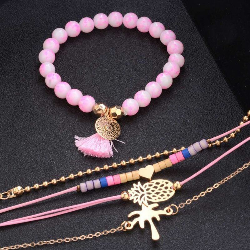 Bohemian Chain Χρυσό Βραχιόλι Σετ 5 Τμχ Ανανάς Από Κερί Σχοινί Φούντες Με Χάντρες Για Γυναίκες