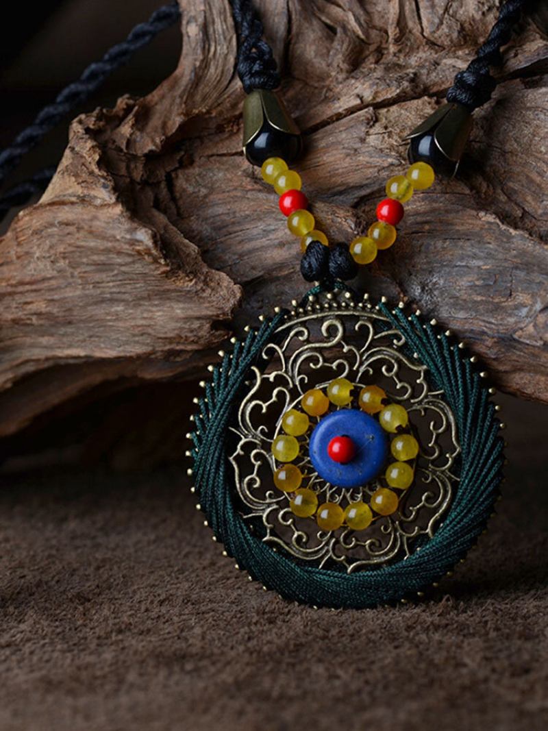 Ethnic Flower Σκαλιστός Αχάτης Κολιέ Τυρκουάζ Μακρύ Στρογγυλό Κρεμαστό Πουλόβερ Access For Her