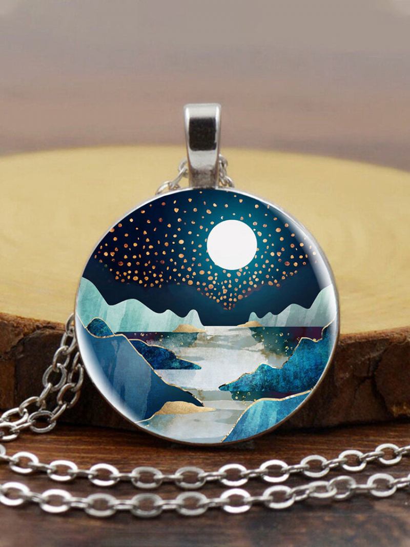 Μοντέρνο Μεταλλικό Στρογγυλό Κολιέ Με Γυάλινη Εκτύπωση Με Φυσικό Τοπίο