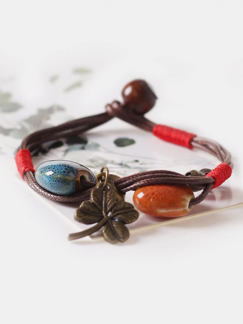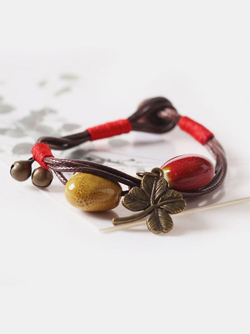 Vintage Διακοσμητικό Τετράφυλλο Τριφύλλι Κουδούνι Σε Σχήμα Καρδιάς Χειροποίητο Βραχιόλι Από Κράμα Από Σχοινί Από Ελαστικό Κεραμικό