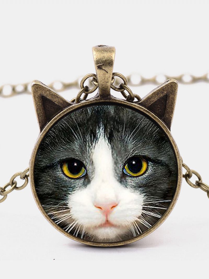 Vintage Εμπριμέ Μαύρο Άσπρο Γυναικείο Κολιέ Γάτα Γυάλινο Κρεμαστό Πουλόβερ