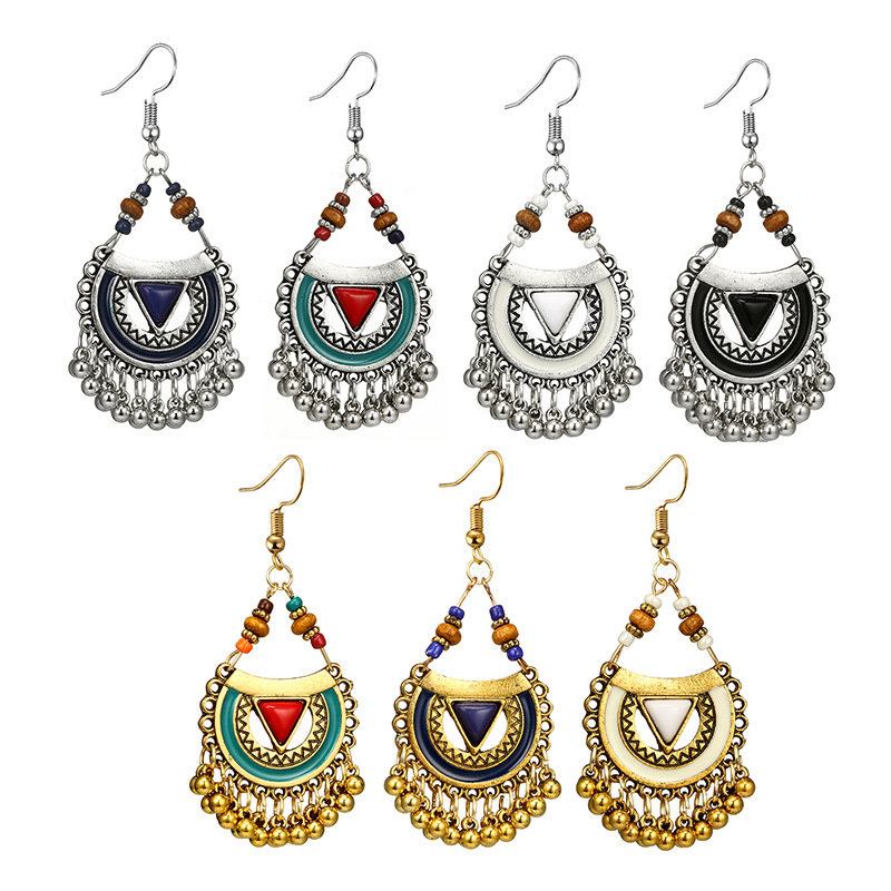 Vintage Γεωμετρικά Κοίλα Ημι-στρογγυλά Κρεμαστά Σκουλαρίκια Με Φούντα Τιρκουάζ Σκαλιστές Χάντρες Μακριά