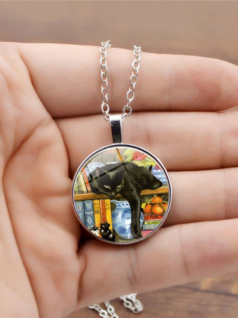 Vintage Γυάλινο Εμπριμέ Γυναικείο Κολιέ Μαύρη Γάτα Βιβλιοθήκη Κρυστάλλινο Κρεμαστό Πουλόβερ Αλυσίδα Κοσμήματα Δώρο
