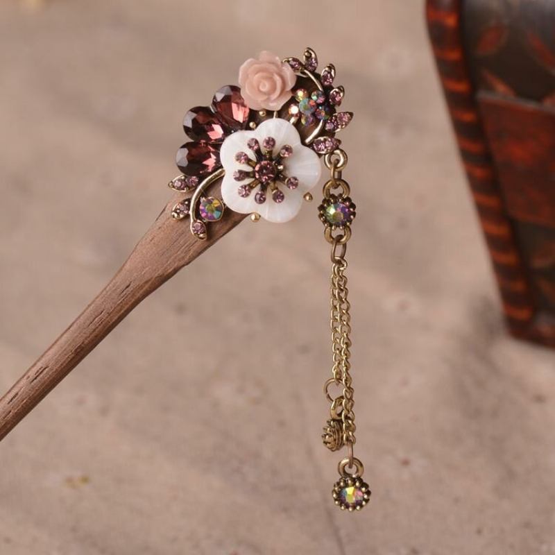 Vintage Ξύλινες Φουρκέτες Κομψό Κέλυφος Διαμαντένιο Λουλούδι Φούντα Κρεμαστό Γυναικείο Αξεσουάρ Μαλλιών