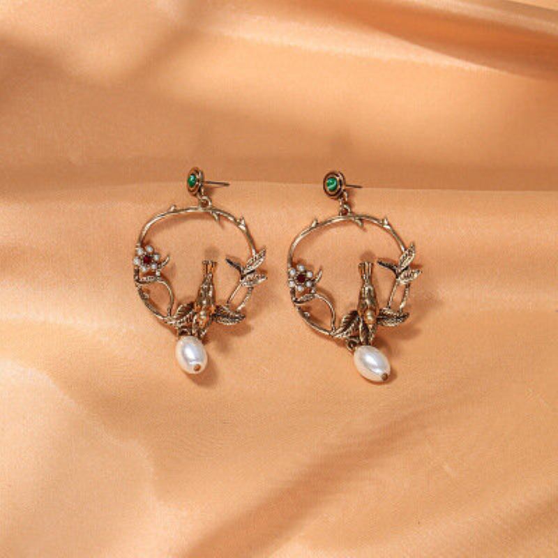 Vintage Μεταλλικά Γεωμετρικά Στερεοσκοπικά Σκουλαρίκια Πουλιών Σκαλιστά Κρεμαστά Μαργαριτάρι Γιρλάντα