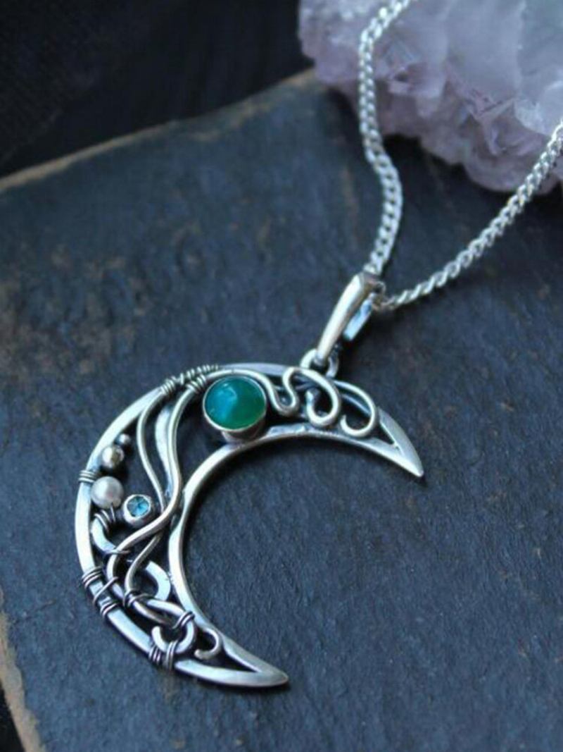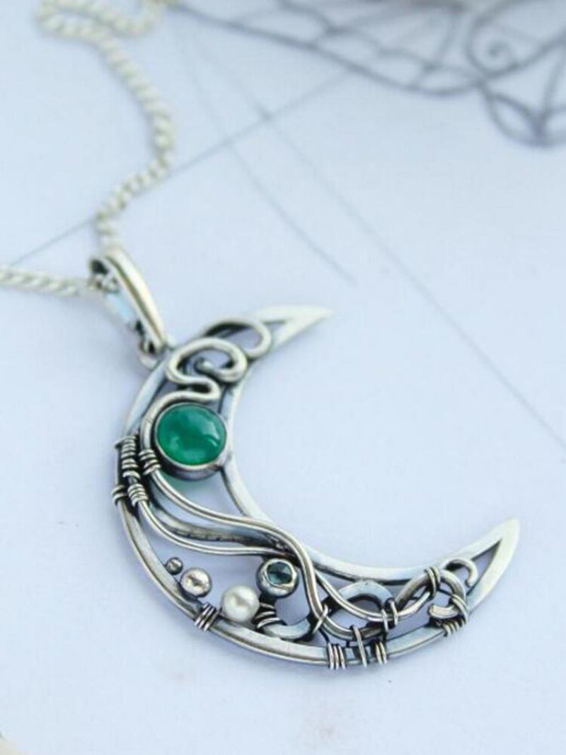 Vintage Μοντέρνο Ένθετο Κολιέ Από Κρεμαστό Κράμα Με Πράσινο Φεγγαρόπετρα Με Τυλιγμένο Σύρμα Σε Σχήμα Φεγγαριού