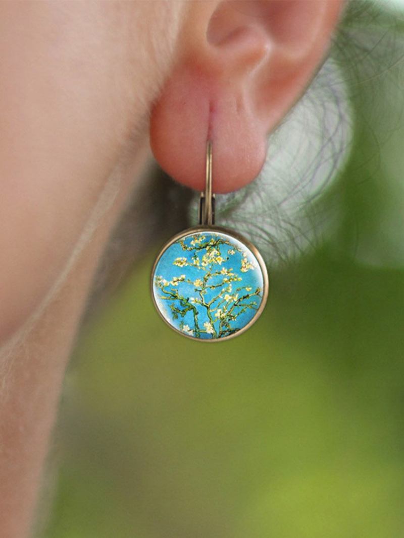 Vintage Στρογγυλό Σχήμα Time Gemstone Πολύχρωμα Σκουλαρίκια Με Τύπωμα Calico Από Κράμα Γυαλιού Από Χαλκό Με Γάντζο Αυτιών